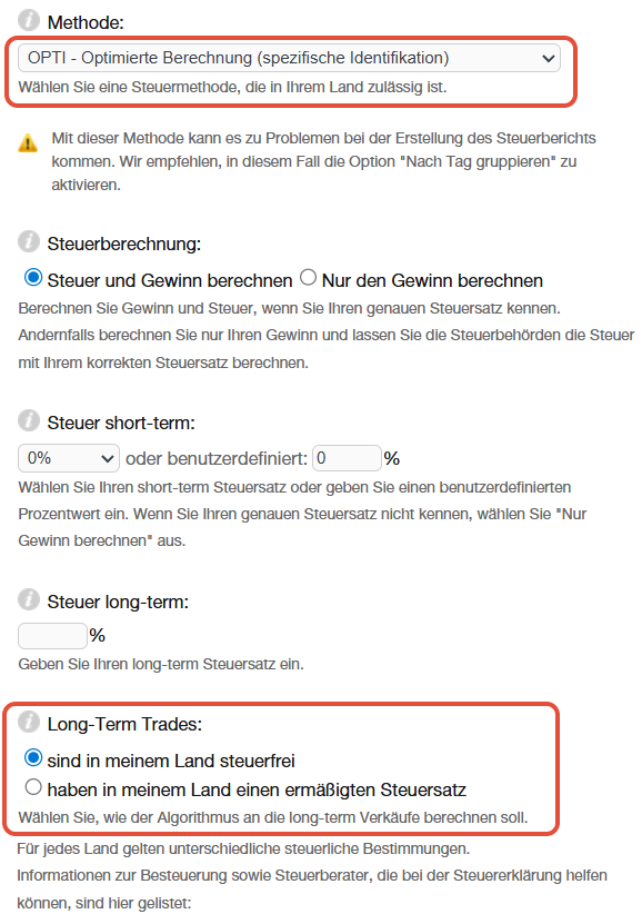 Die Berechnung nach der OPTI-Methode ermöglicht es Dir – abhängig von der steuerlichen Behandlung von Long-Term Trades in Deinem Land – zwischen zwei Optionen zu wählen. Die bevorzugte Variante kannst Du in den Einstellungen des Steuerberichts festlegen.