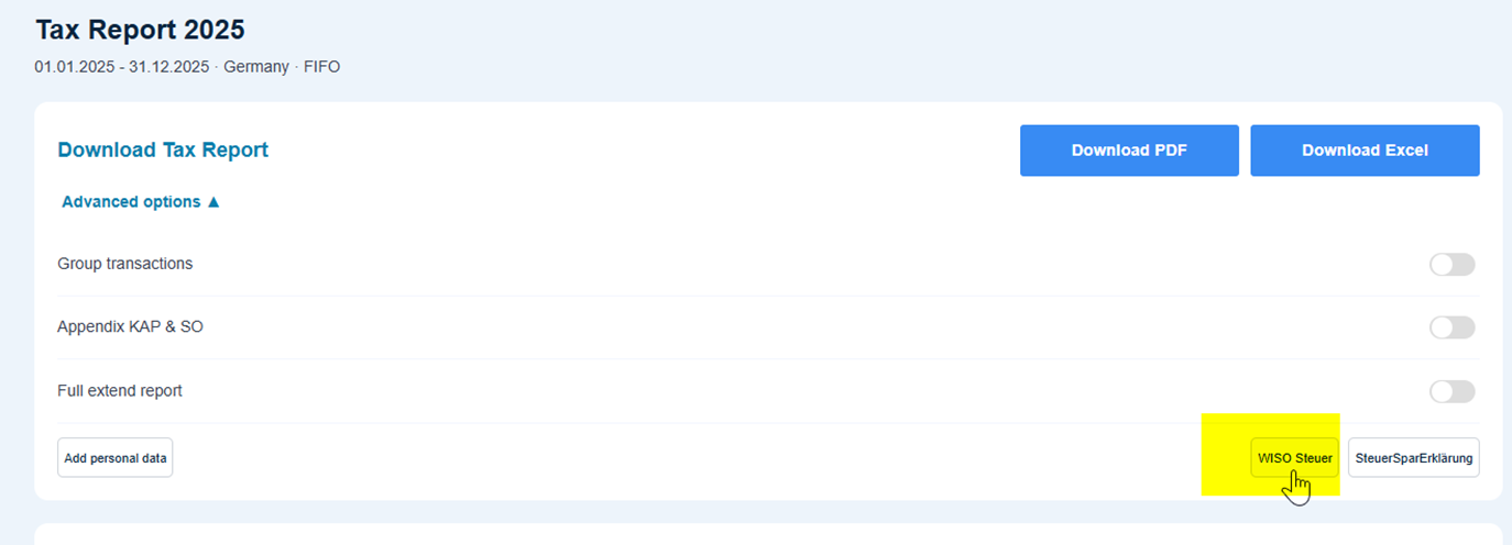 Die nicht unterstützten Transaktionsarten können als Summen ggf. manuell in WISO eingetragen werden. Dafür haben wir jedoch eine Ausfüllhilfe zu KAP+SO beim Download des Steuerberichtes, die du nutzen kannst. Am Ende obliegt es dir, wie viele und welche Berichte du als Nachweis den Behörden übermittelst.