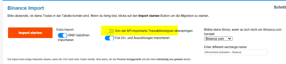 Für Binance sollten ältere Daten per CSV und laufende Daten per API importiert werden. Einige Transaktionstypen werden nicht vollständig unterstützt oder können Abweichungen verursachen.