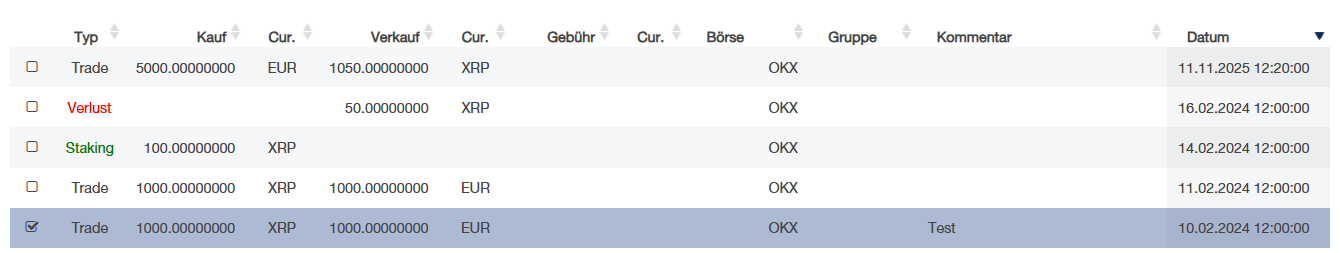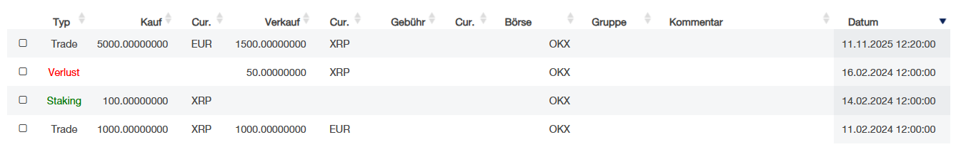 Nach Typ, Börse, Gruppe oder Datum filtern