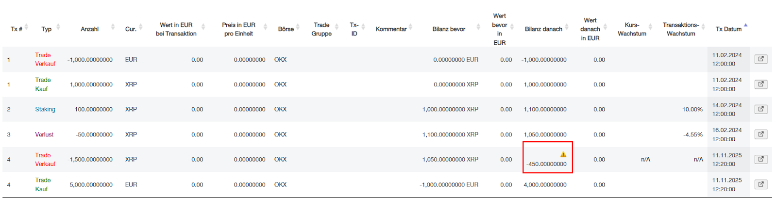 → CoinTracking erzeugt unmittelbar eine Warnung.