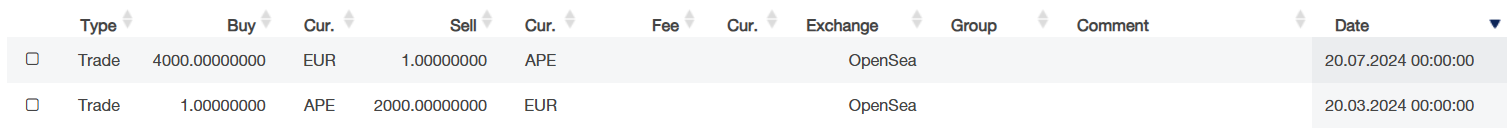 The purchase and sale are entered with the transaction type "Trade". Profits and losses from trading NFTs are shown in the tax report under "1.3. Taxable income from speculative transactions with NFTs according to § 31 EStG".The NFT can be classified in the NFT Center.