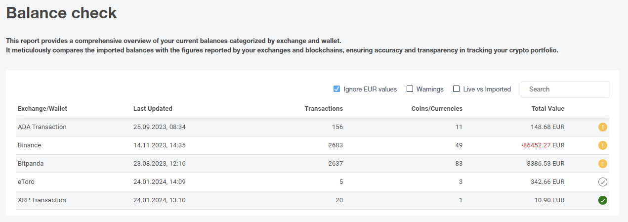 The "Balance Check" report provides a comprehensive overview of your current balances categorized by exchange and wallet. It meticulously compares the imported balances with the figures reported by your exchanges and blockchains.