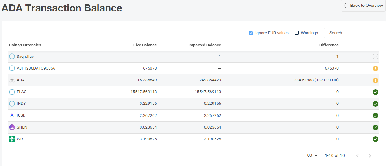 - Difference: Shows the difference between the Live Balance and Imported Balance amount; if available the fiat value will be shown as well